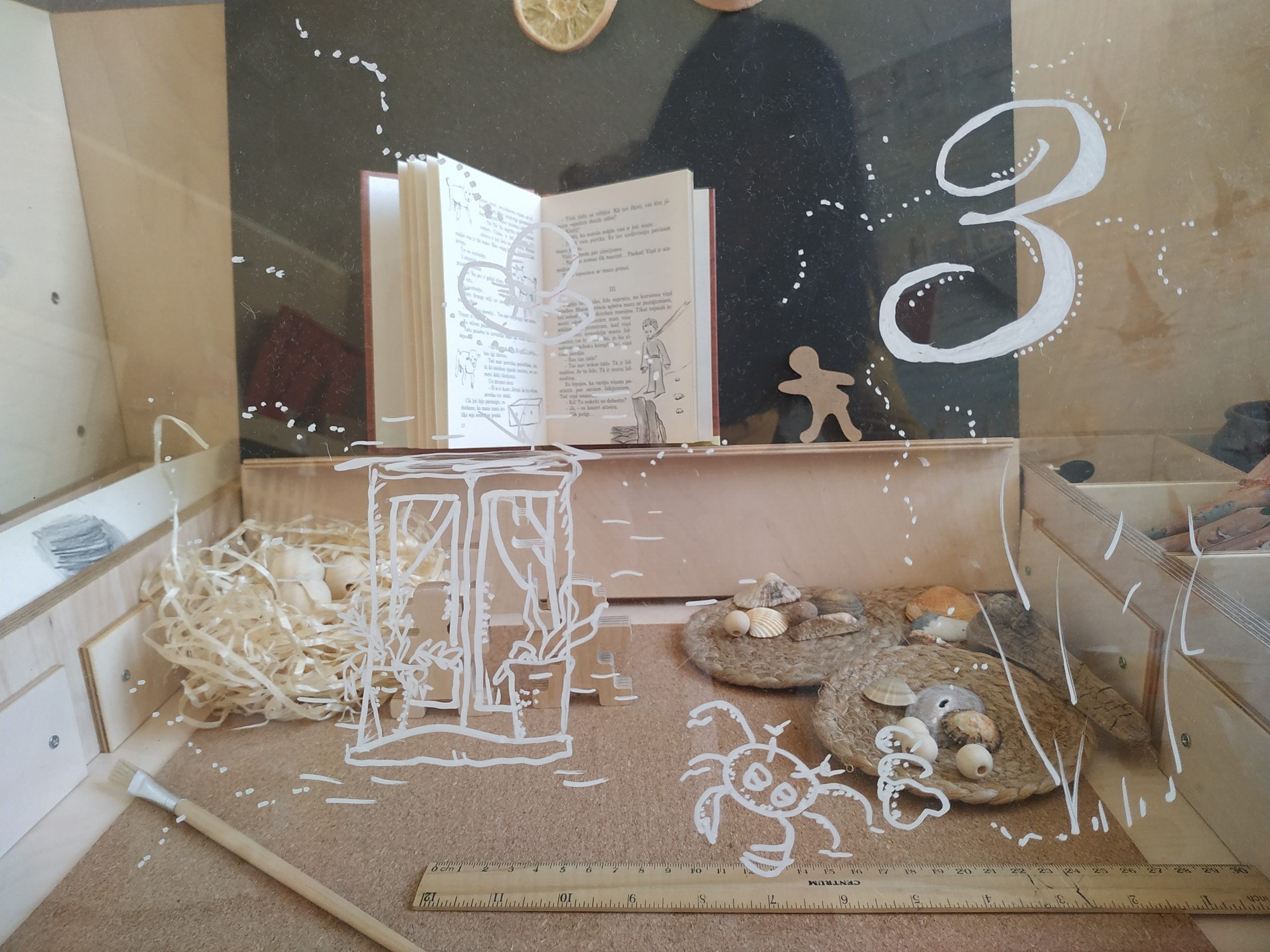 The table includes a chalkboard surface, transparent acrylic board, and a roll of paper for endless drawing and tracing. Inside, there’s storage for books, toys, or sensory materials like sand. The lid lifts securely and locks in place for safe use, doubling as a personal display board or secret shelf. Side compartments hold pencils, small items, or a water bowl—stable and easy to clean.
